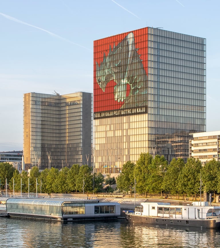 La façade de la BNF a été transformée pour célébrer le lancement de la série Kaiju n°8 en France. Avec un habillage événementiel de 46m de haut, l’univers manga a envahi le bâtiment offrant un visuel époustouflant aux passants.
